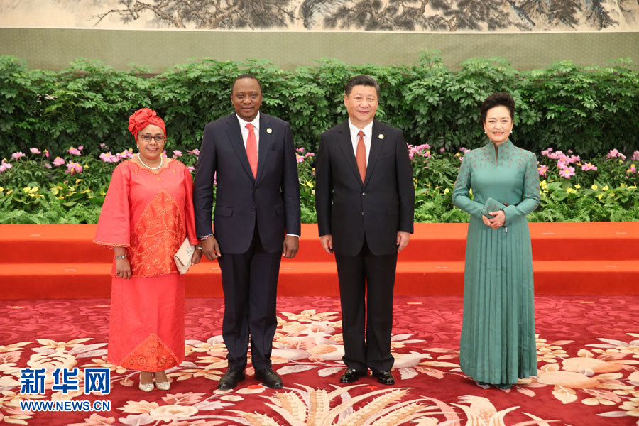 5月14日,国家主席习近平在北京人民大会堂举行宴会,欢迎出席“一带一路”国际合作高峰论坛的外方代表团团长及嘉宾。这是习近平和夫人彭丽媛迎候肯尼亚总统肯雅塔和夫人。新华社记者 姚大伟 摄