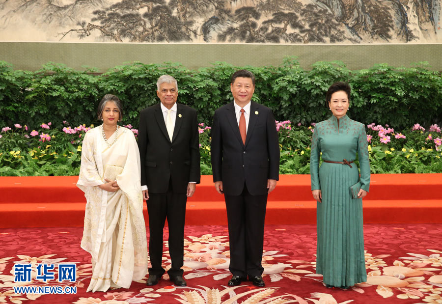 5月14日,国家主席习近平在北京人民大会堂举行宴会,欢迎出席“一带一路”国际合作高峰论坛的外方代表团团长及嘉宾。这是习近平和夫人彭丽媛迎候斯里兰卡总理维克勒马辛哈和夫人。新华社记者 姚大伟 摄