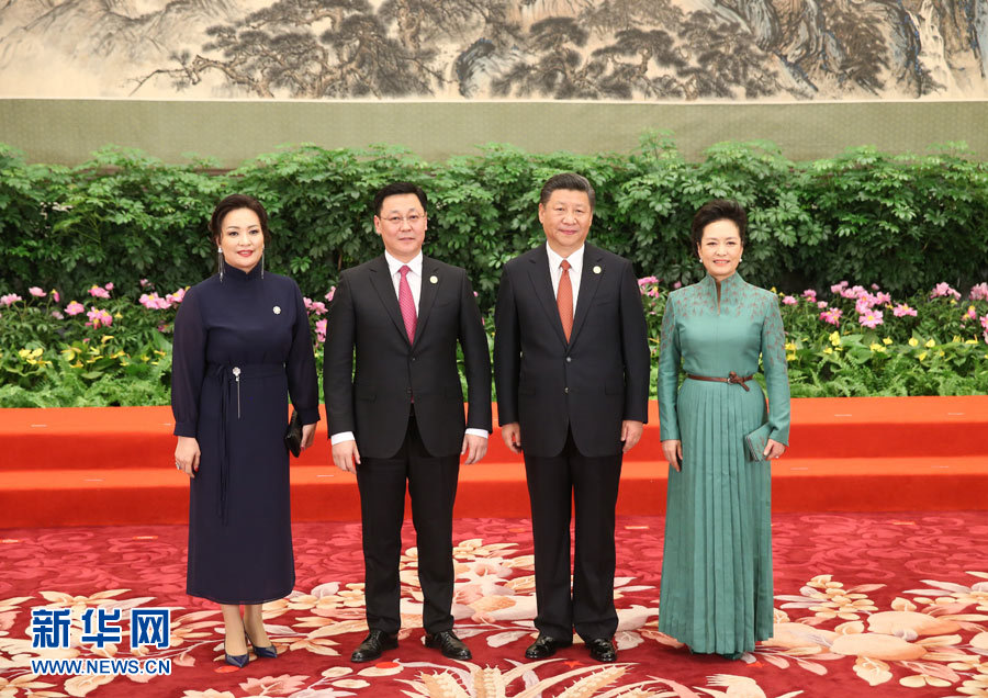 5月14日,国家主席习近平在北京人民大会堂举行宴会,欢迎出席“一带一路”国际合作高峰论坛的外方代表团团长及嘉宾。这是习近平和夫人彭丽媛迎候蒙古国总理额尔登巴特和夫人。新华社记者 姚大伟 摄