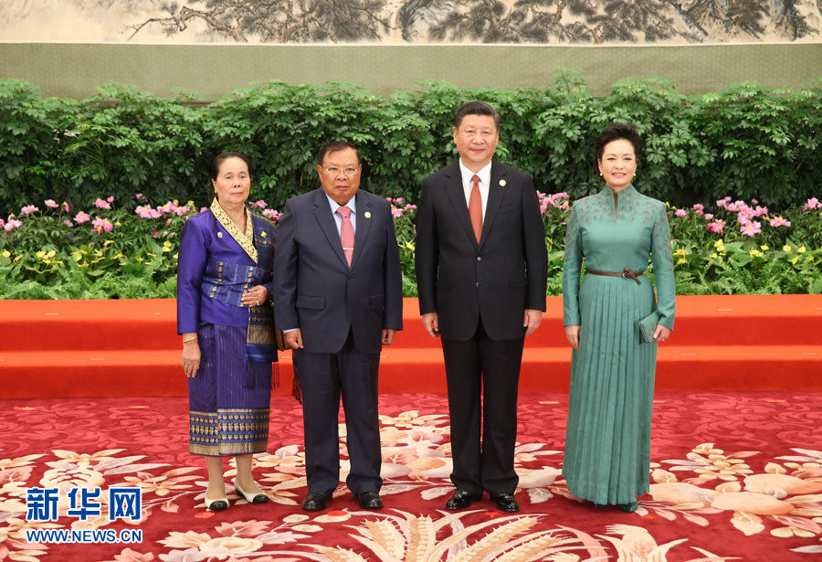 5月14日,国家主席习近平在北京人民大会堂举行宴会,欢迎出席“一带一路”国际合作高峰论坛的外方代表团团长及嘉宾。这是习近平和夫人彭丽媛迎候老挝国家主席本扬和夫人。新华社记者 姚大伟 摄