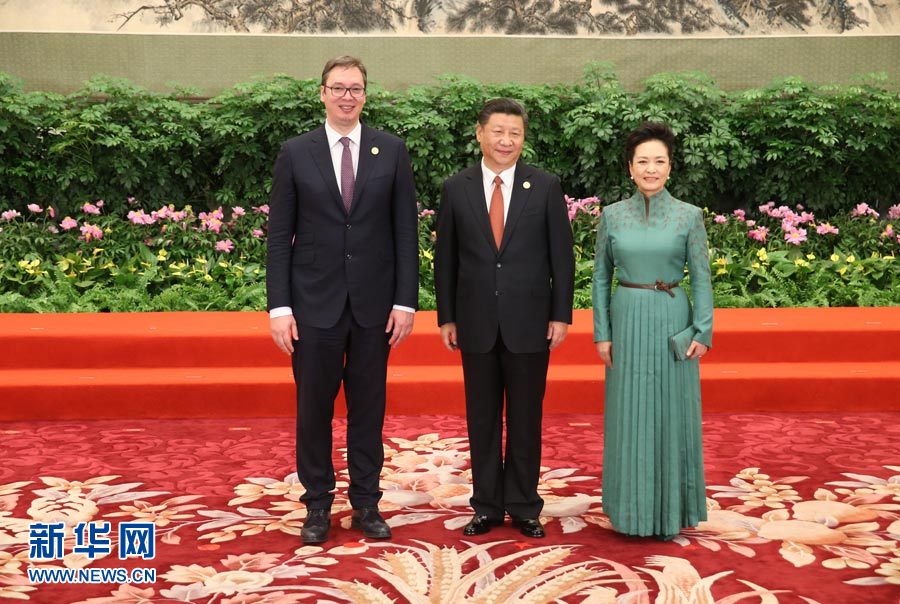 5月14日,国家主席习近平在北京人民大会堂举行宴会,欢迎出席“一带一路”国际合作高峰论坛的外方代表团团长及嘉宾。这是习近平和夫人彭丽媛迎候塞尔维亚总理武契奇。新华社记者 姚大伟 摄