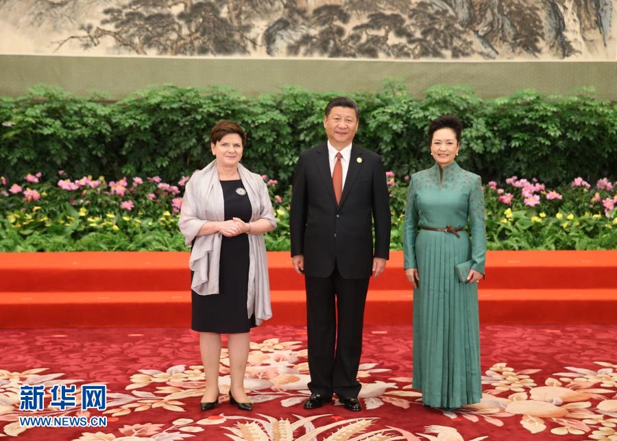 5月14日,国家主席习近平在北京人民大会堂举行宴会,欢迎出席“一带一路”国际合作高峰论坛的外方代表团团长及嘉宾。这是习近平和夫人彭丽媛迎候波兰总理希德沃。新华社记者 姚大伟 摄