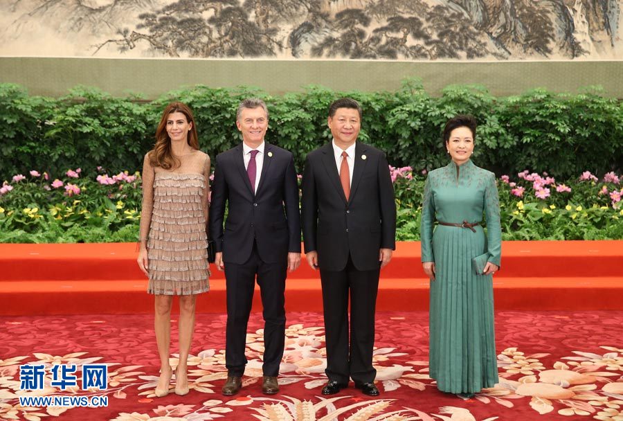 5月14日,国家主席习近平在北京人民大会堂举行宴会,欢迎出席“一带一路”国际合作高峰论坛的外方代表团团长及嘉宾。这是习近平和夫人彭丽媛迎候阿根廷总统马克里和夫人。新华社记者 姚大伟 摄
