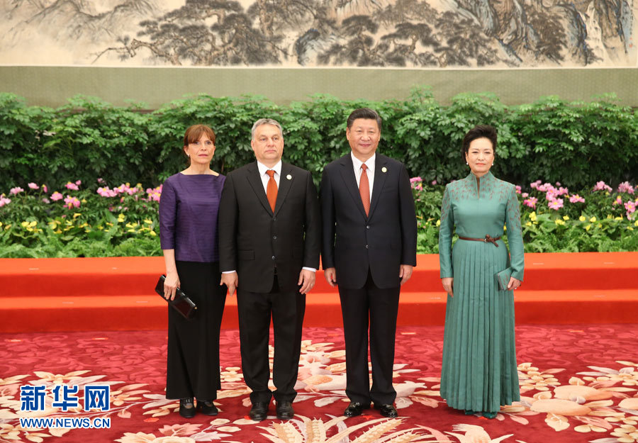 5月14日,国家主席习近平在北京人民大会堂举行宴会,欢迎出席“一带一路”国际合作高峰论坛的外方代表团团长及嘉宾。这是习近平和夫人彭丽媛迎候匈牙利总理欧尔班和夫人。新华社记者 姚大伟 摄