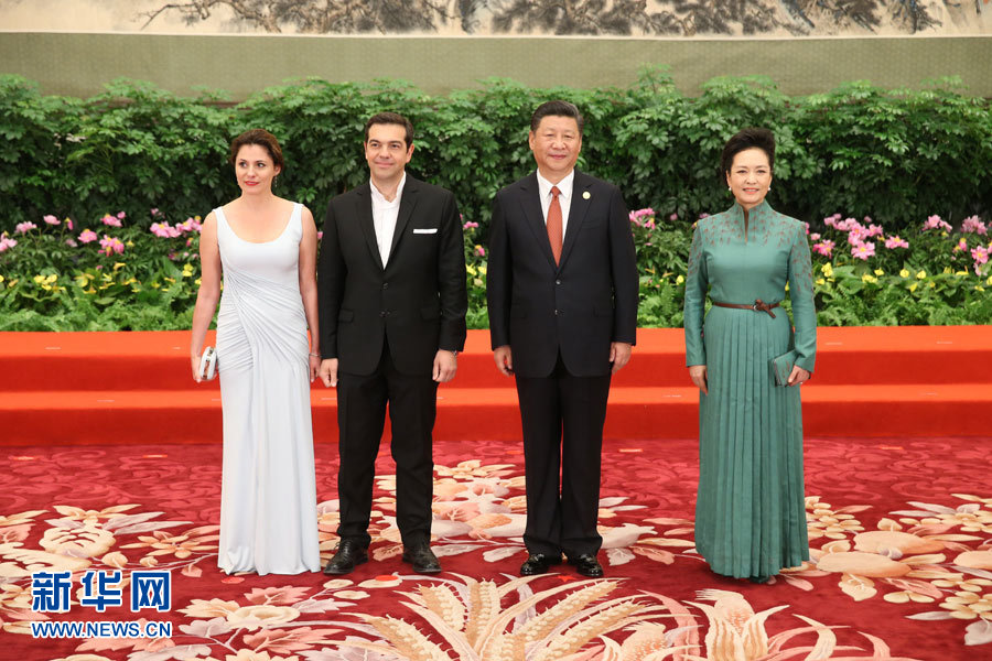 5月14日,国家主席习近平在北京人民大会堂举行宴会,欢迎出席“一带一路”国际合作高峰论坛的外方代表团团长及嘉宾。这是习近平和夫人彭丽媛迎候希腊总理齐普拉斯和巴齐亚娜女士。新华社记者 姚大伟 摄