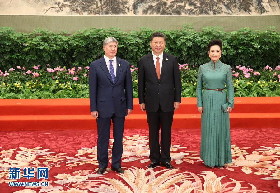 5月14日,国家主席习近平在北京人民大会堂举行宴会,欢迎出席“一带一路”国际合作高峰论坛的外方代表团团长及嘉宾。这是习近平和夫人彭丽媛迎候吉尔吉斯斯坦总统阿塔姆巴耶夫。新华社记者 姚大伟 摄
