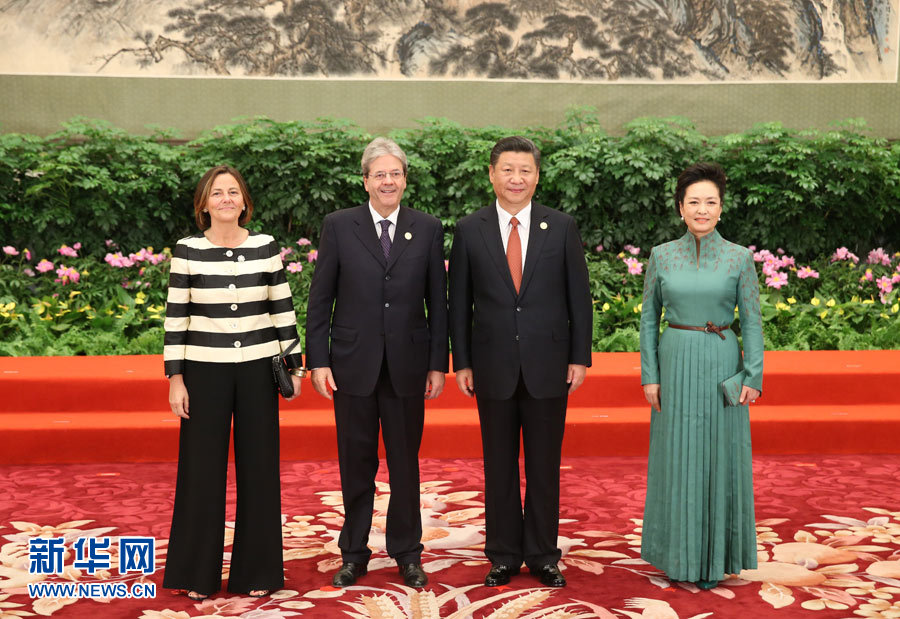 5月14日,国家主席习近平在北京人民大会堂举行宴会,欢迎出席“一带一路”国际合作高峰论坛的外方代表团团长及嘉宾。这是习近平和夫人彭丽媛迎候意大利总理真蒂洛尼和夫人。新华社记者 姚大伟 摄