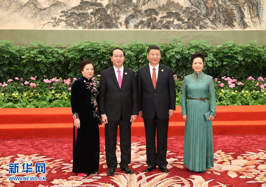 5月14日,国家主席习近平在北京人民大会堂举行宴会,欢迎出席“一带一路”国际合作高峰论坛的外方代表团团长及嘉宾。这是习近平和夫人彭丽媛迎候越南国家主席陈大光和夫人。新华社记者 姚大伟 摄