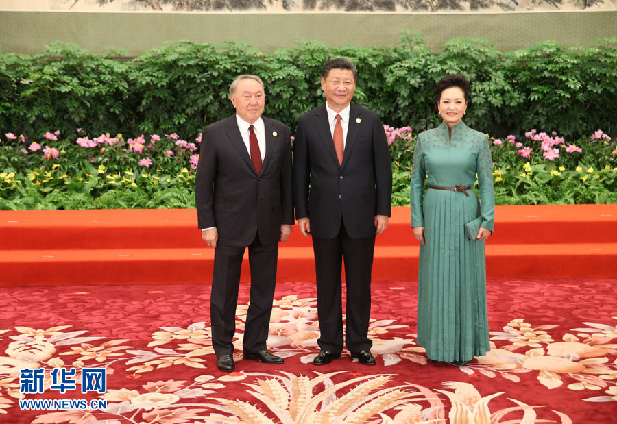 5月14日,国家主席习近平在北京人民大会堂举行宴会,欢迎出席“一带一路”国际合作高峰论坛的外方代表团团长及嘉宾。这是习近平和夫人彭丽媛迎候哈萨克斯坦总统纳扎尔巴耶夫。新华社记者 姚大伟 摄