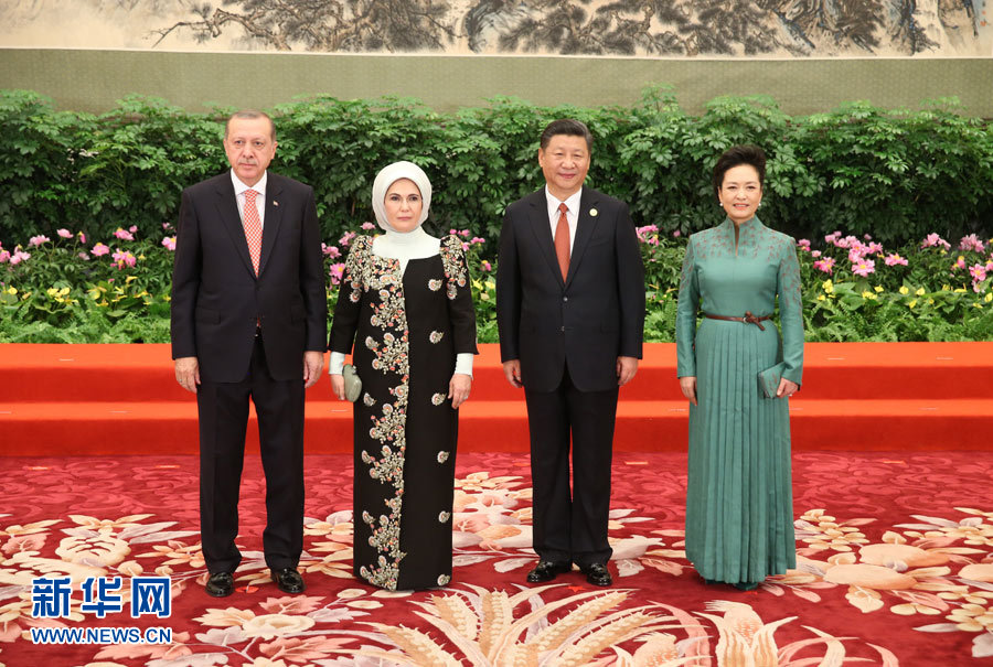 5月14日,国家主席习近平在北京人民大会堂举行宴会,欢迎出席“一带一路”国际合作高峰论坛的外方代表团团长及嘉宾。这是习近平和夫人彭丽媛迎候土耳其总统埃尔多安和夫人。新华社记者 姚大伟 摄