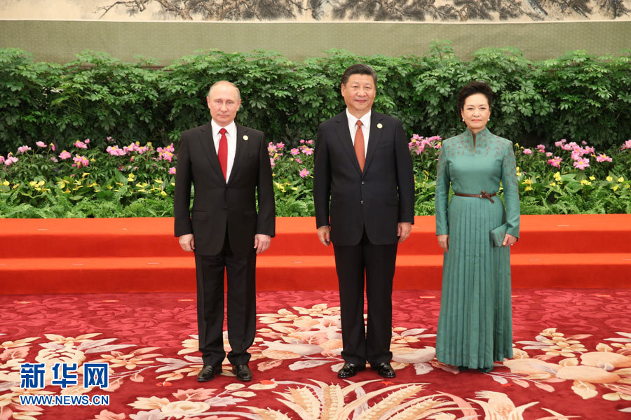 5月14日,国家主席习近平在北京人民大会堂举行宴会,欢迎出席“一带一路”国际合作高峰论坛的外方代表团团长及嘉宾。这是习近平和夫人彭丽媛迎候俄罗斯总统普京。新华社记者 姚大伟 摄