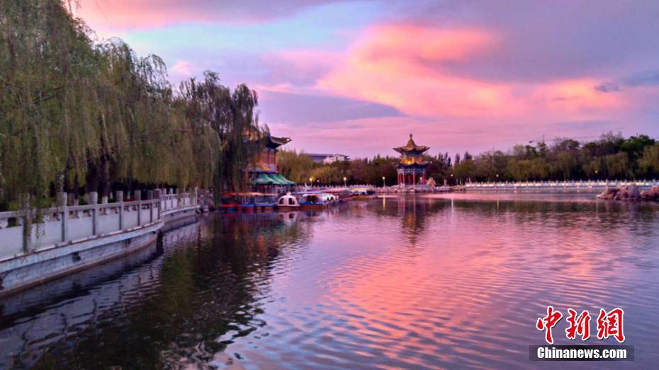 5月14日,甘肃金昌市城区雨后霞光满天。傍晚时分,金川公园里云霞辉映,湖光倒影,风景如画。 王永松 摄