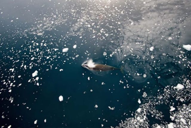 图为Lemaire海峡,一头南极小须鲸游过一片碎冰区。当鲸鱼突然潜入水底时,照相机也跟随它深入水底。从拍摄的照片也能看出南极冰川消融的现象,研究人员希望这组照片能引导大家关注气候变暖的影响。