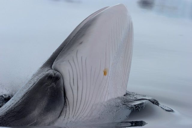 图为Wilhelmina湾的一头小须鲸。相机拍到了它嘴巴的下部以及进食时扩张的喉腹折(从喉部到腹部的凹槽,便于进食)。照片上也可以看到鲸的眼睛。这些数据可以让研究人员了解鲸的各种进食方法。