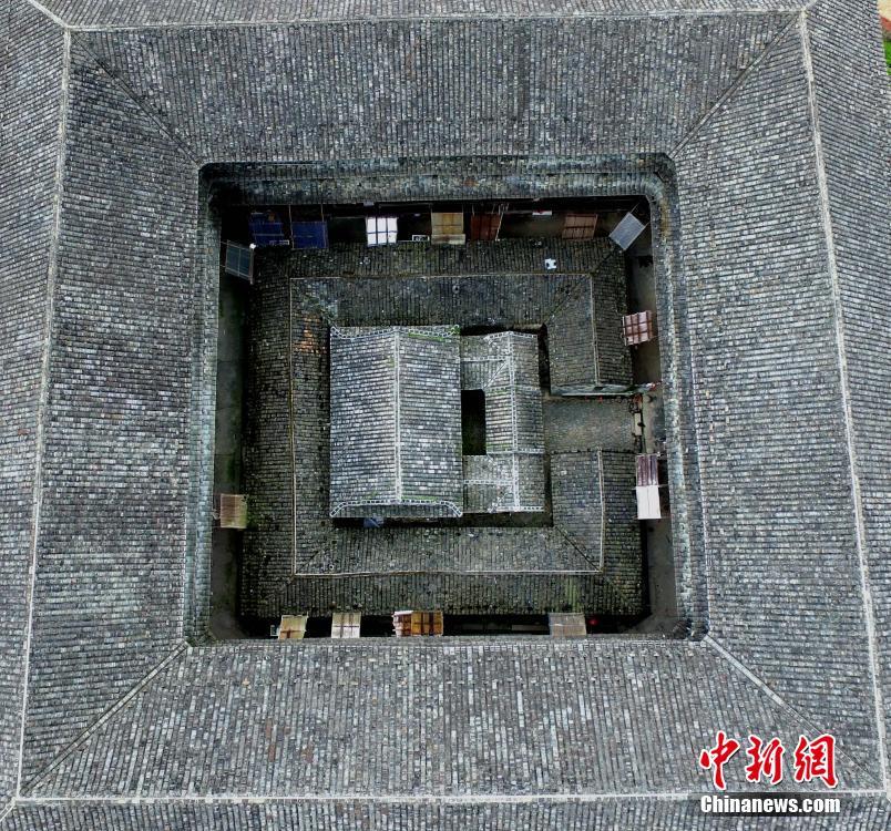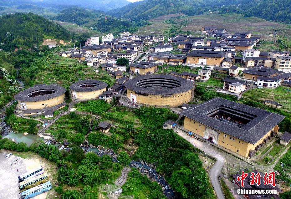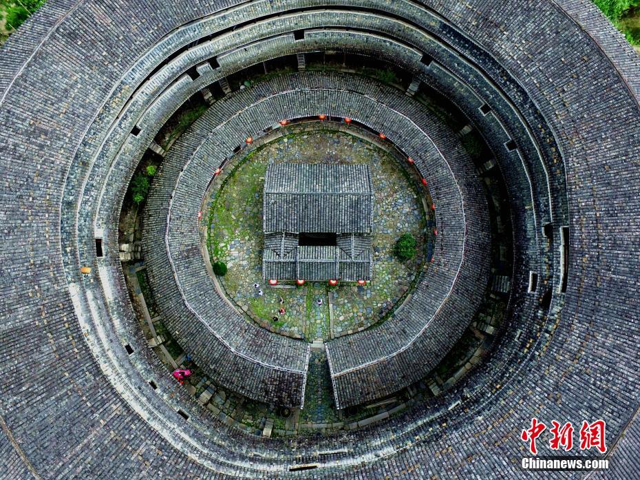 5月上旬,空中鸟瞰福建永定初溪土楼群,蔚为壮观。土楼是分布在中国东南部的福建、江西、广东三省的客家地区,以生土为主要建筑材料、生土与木结构相结合,并不同程度使用石材的大型民居建筑。它们是几次中国乃至东亚历史动荡和民众大迁徙的产物,其中分布最广、数量最多、品类最丰富、保存最完好的,是福建土楼。中新社记者王东明 摄