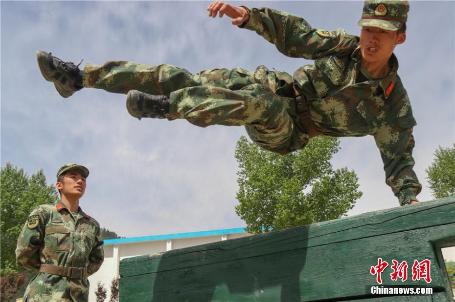 5月中旬,武警甘肃陇南市森林支队抽调基层官兵在甘南藏族自治州迭部县高海拔地区进行强化训练,锻炼官兵爆发力、耐力、身体柔韧性及平衡性,并通过此项训练培养官兵坚韧不拔的意志力。图为战士飞跃高板跳台。李靠军 摄