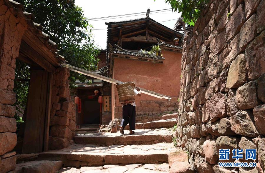 云南云龙县诺邓古村的农民行走在石板路上(5月14日摄)。新华社记者杨宗友摄