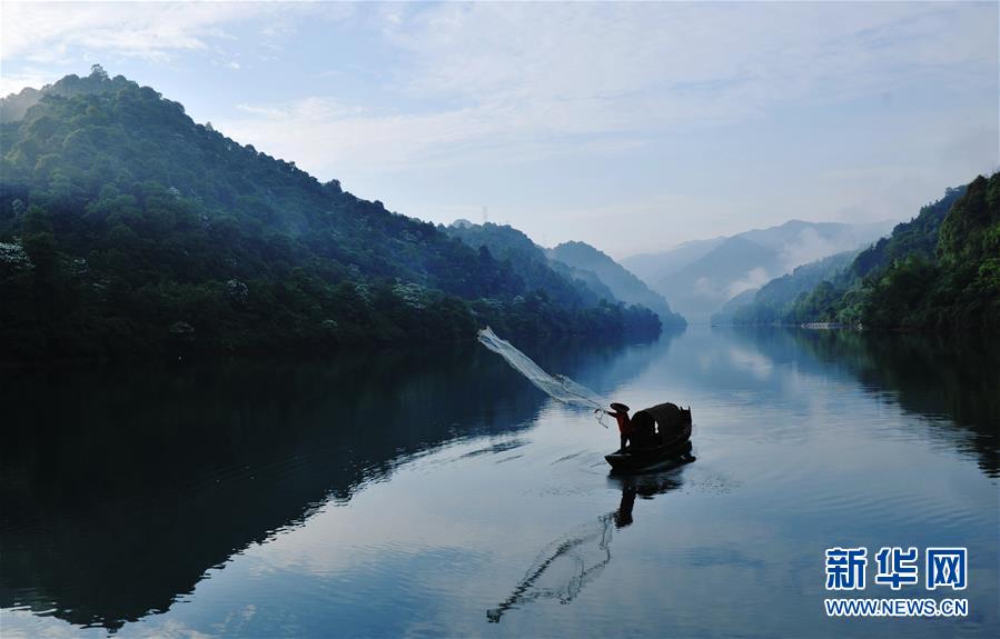 5月17日,在湖南资兴市东江湖,一名渔民在湖面撒网。当日清晨,湖南郴州资兴市东江湖湖面水汽弥漫,飘逸的薄雾和摇橹的轻舟构成一幅水墨画。新华社发(吴勇兵 摄)