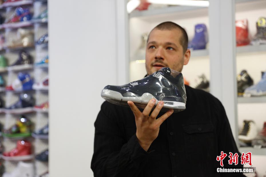 当地时间5月16日,马克菲特展示售价为23000美元的运动鞋。马克菲特的潮鞋店名为StadiumGoods,位于纽约曼哈顿SOHO商业区,该店运动鞋和街头服饰齐全同时面向收藏者服务。马克菲特去年8月将店铺入驻淘宝网天猫国际后,目前通过互联网面向中国消费者的销售额已达数百万美元,他们每天通过天猫国际向中国发货数百双。中新社记者 廖攀 摄