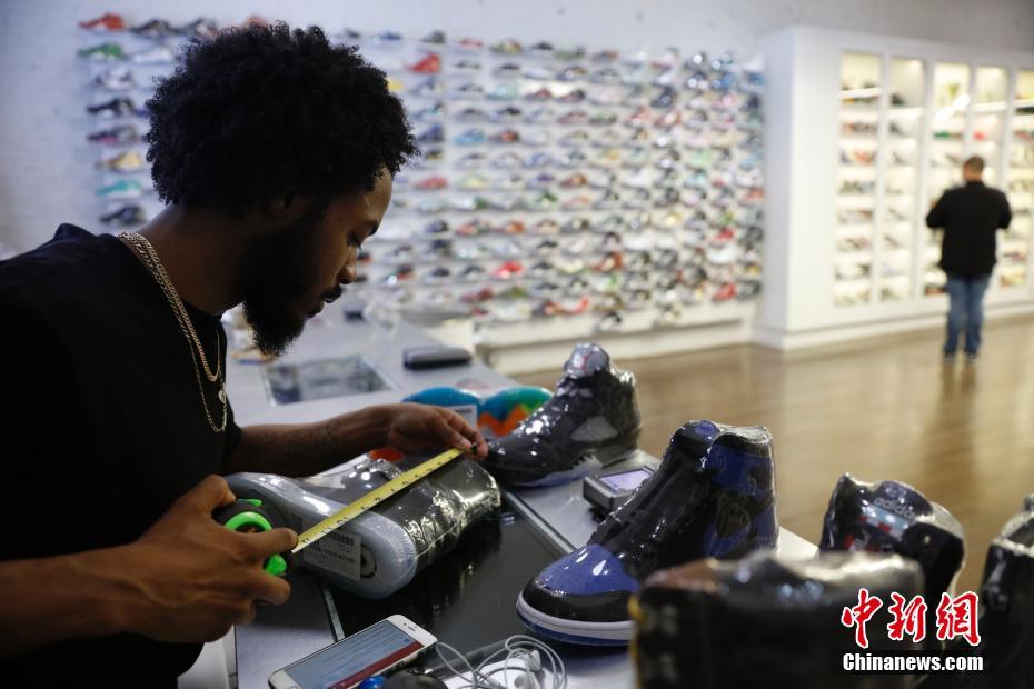 当地时间5月16日,店铺开门前,店员用尺子衡量鞋子。该店的鞋类、服饰通过网络销往世界各地。马克菲特的潮鞋店名为StadiumGoods,位于纽约曼哈顿SOHO商业区,该店运动鞋和街头服饰齐全同时面向收藏者服务。马克菲特去年8月将店铺入驻淘宝网天猫国际后,目前通过互联网面向中国消费者的销售额已达数百万美元,他们每天通过天猫国际向中国发货数百双。中新社记者 廖攀 摄