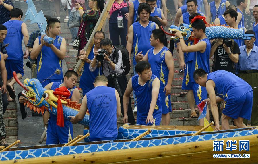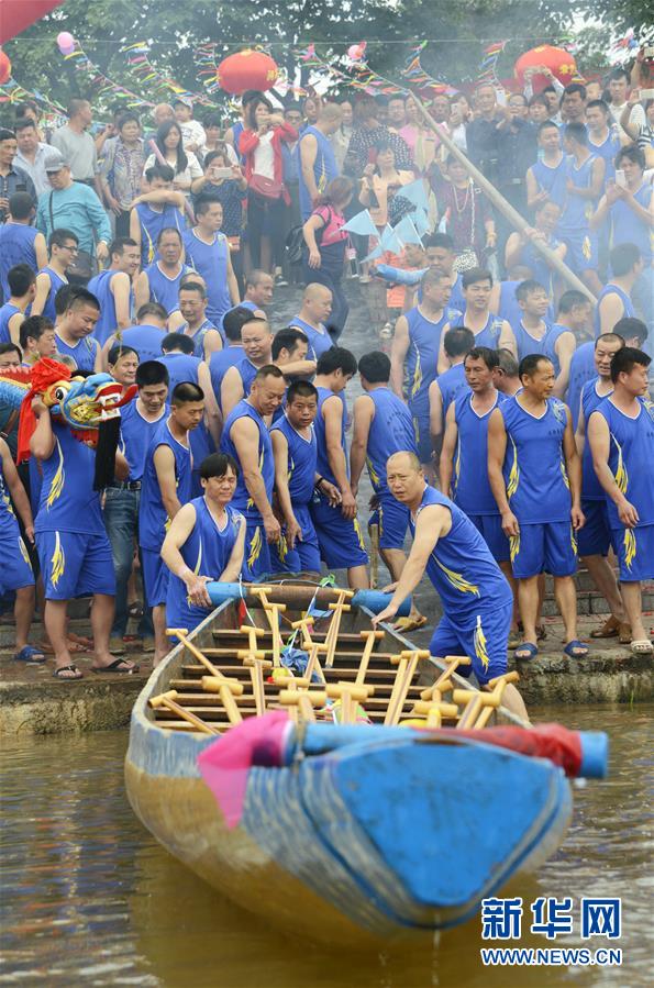 5月16日,在江西省赣州市水西镇章江江岸,龙舟队队员在“顺水”仪式上安装“龙头”。当日,江西省赣州市水西镇当地龙舟队在章江水面举行龙舟“顺水”祭礼仪式,拉开了一年一度“水西端午龙舟”民间体育赛事活动的序幕。“水西端午龙舟”是当地特色旅游项目之一,每年端午节吸引众多游客前来观看。新华社发(刘念海摄)