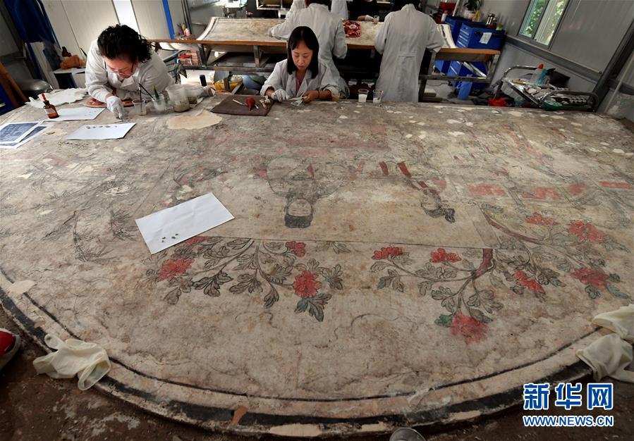 5月16日,河南洛阳古代艺术博物馆壁画修复中心的壁画修复师在工作室内修复一幅明代壁画。新华社记者 李安 摄