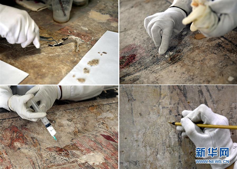 左上:壁画修复师在对一幅壁画进行碎块拼对;右上:壁画修复师在对壁画表面缺失处进行填补;左下:壁画修复师在对壁画进行表面碎块加固;右下:壁画修复师在对壁画填补处着色(拼版照片,5月16日摄)。新华社记者李安 摄