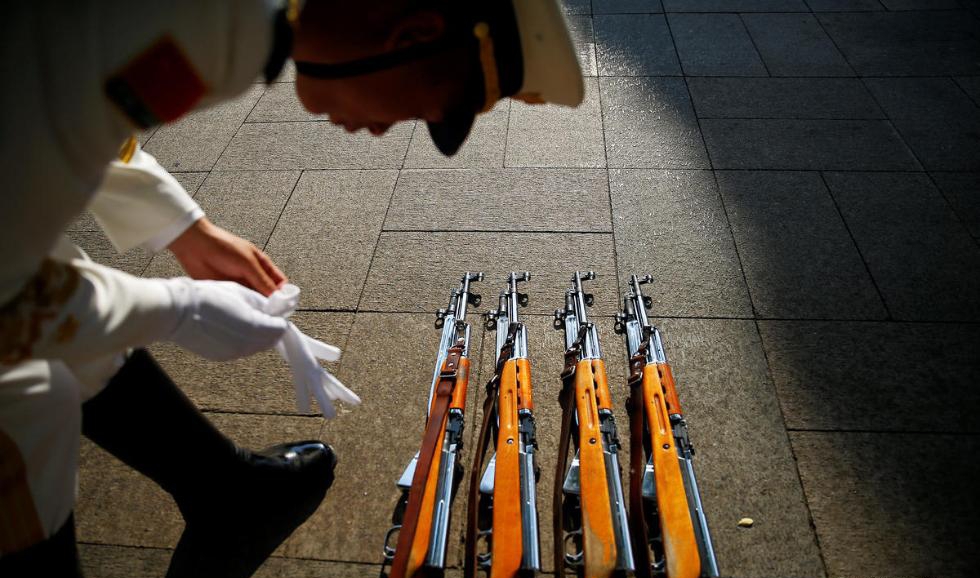 仪仗队士兵整理枪支。