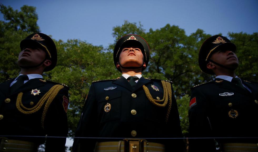 三军仪仗队士兵在高温下军容严整。北京去年的首个高温预警在6月21日才发出,今年提早整整一个月。