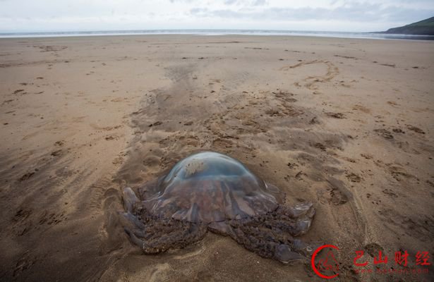 近两周,在英国德文郡的海滩上,当地居民已经发现很多体型较小的水母。不过最近被冲上岸的这只水母能称得上"巨型"。图为"搁浅"的水母,摊开来像伞面。