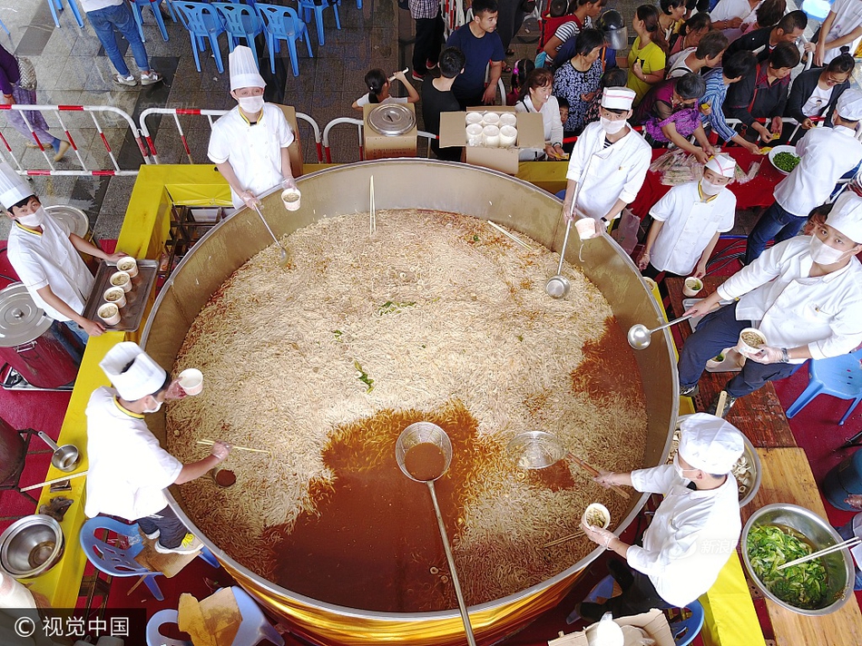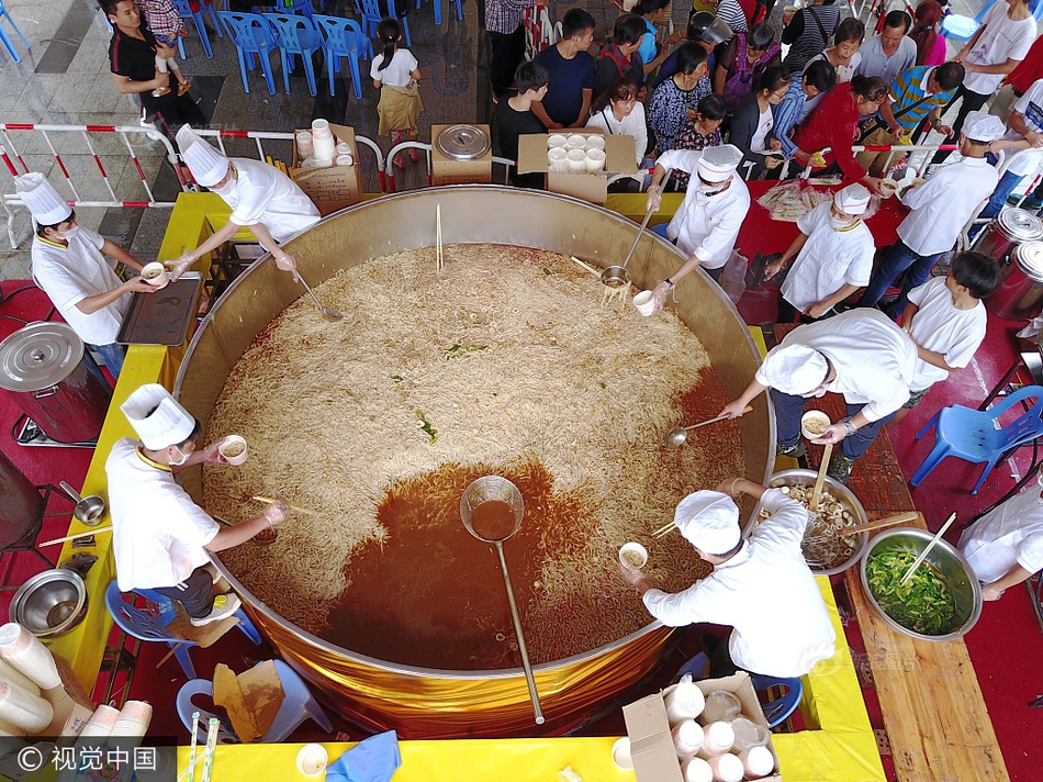 2017年5月20日,南宁。一人多高的大锅内,800多斤米粉与上千斤的配料,煮出了史上最大碗的老友粉。供图:视觉中国