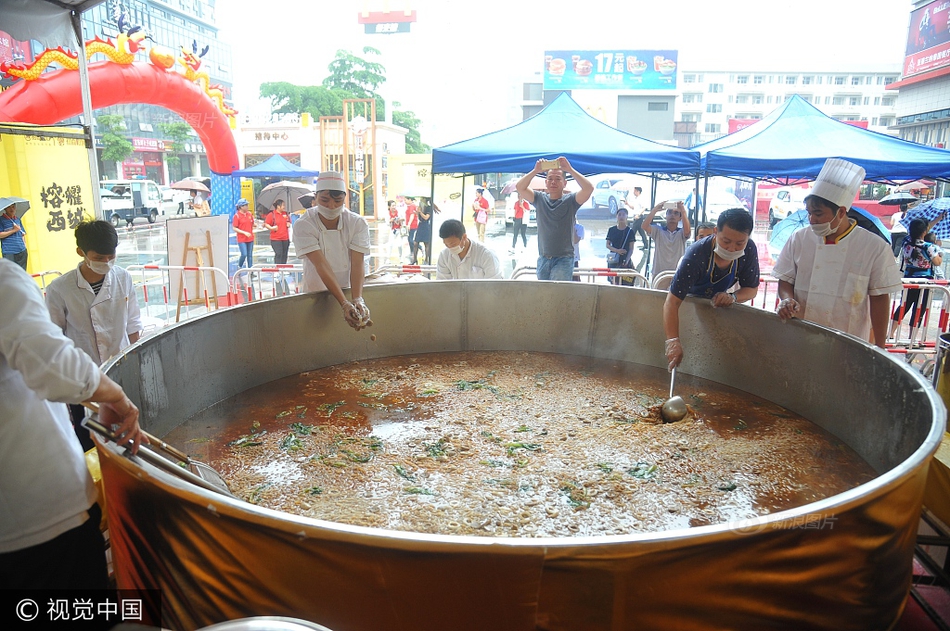 当天,大雨棚中,近十名穿着厨师服饰的男子正围着一口直径三米多的大锅忙碌着,大锅旁边,几口直径七八十公分的铁锅正在翻炒配料。
