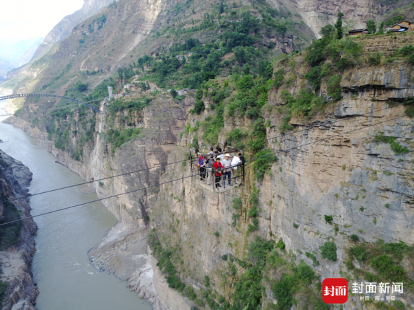 溜索运行比较平稳,就像是个四面悬空的超级观景台。到金沙江中间时,脚下就是300米深的峡谷,江水像是一条带子,而抬头看前方,则是笔直的峭壁,不免令人心惊。