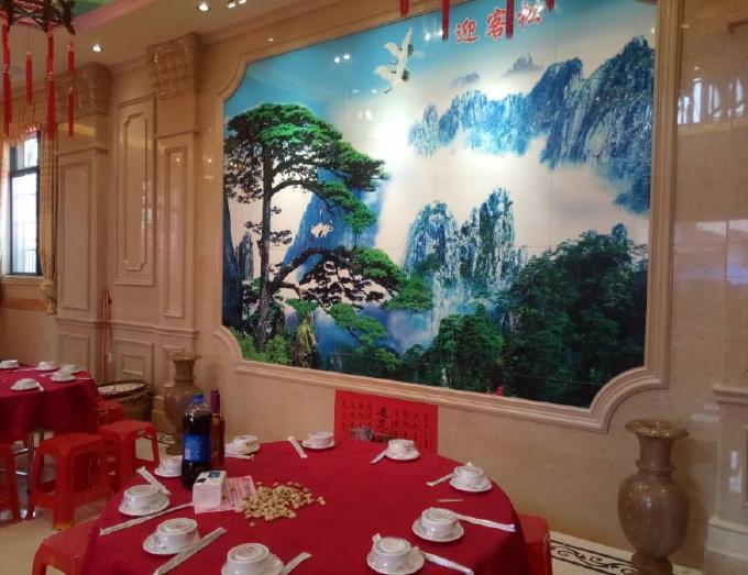 每层楼的大厅都贴有迎客松壁画。