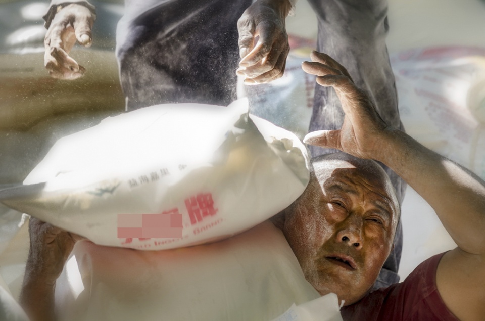 在安徽淮南市田家庵的一条老街上有一家老库房,老板用它来转运面粉和食用油。郭大爷是土生土长的本地人,做装卸工这一行已经有十多年了。今年63岁的郭大爷,带着几位年轻一点的伙计常年在这里为干着装卸工的活。这个简单的物流仓库每个月大约有40车的流通量,装食用油的车载货1380件,每件装卸费用0.25元。拉面粉的车装载大约32吨,装卸费每吨10元,4个人卸载完每人能分得80元左右。图为郭大爷吃力地扛着两袋面粉。来源:黑土影像
