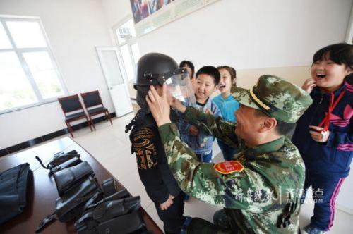 孩子们在边防派出所里体验警用装备,这里给孩子带来很多乐趣。