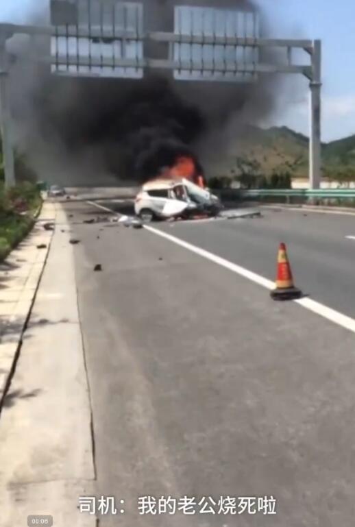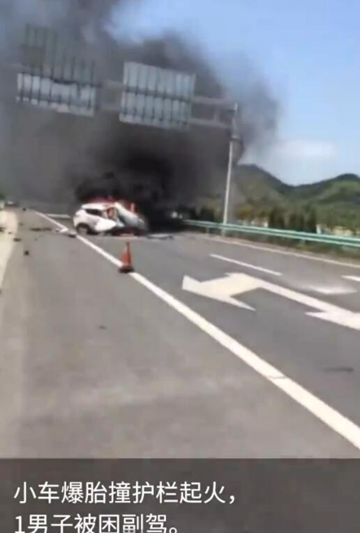 【汽车爆胎起火,她眼睁睁看着丈夫在眼前被烧死】5月27日,贵州罗甸,一女子驾车行驶在高速路时,车子突然爆胎撞向护栏,变形起火,她的丈夫被卡在副驾驶无法逃脱,女子被路人拉住,眼睁睁看着着火的车子大哭:“我的老公烧死了啊!”