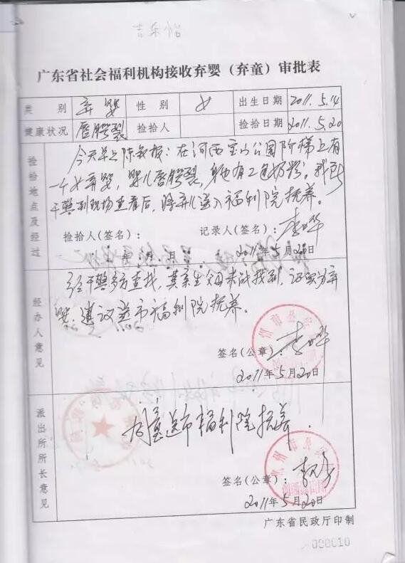 据介绍,2011年5月20日,一名女婴被遗弃在化州市河西宝山公园阶梯上。由于找不到女婴的父母,按照相关程序,女婴被作为弃婴被我市福利院监护抚养,并取了一个吉祥的名字“吉乐怡”。