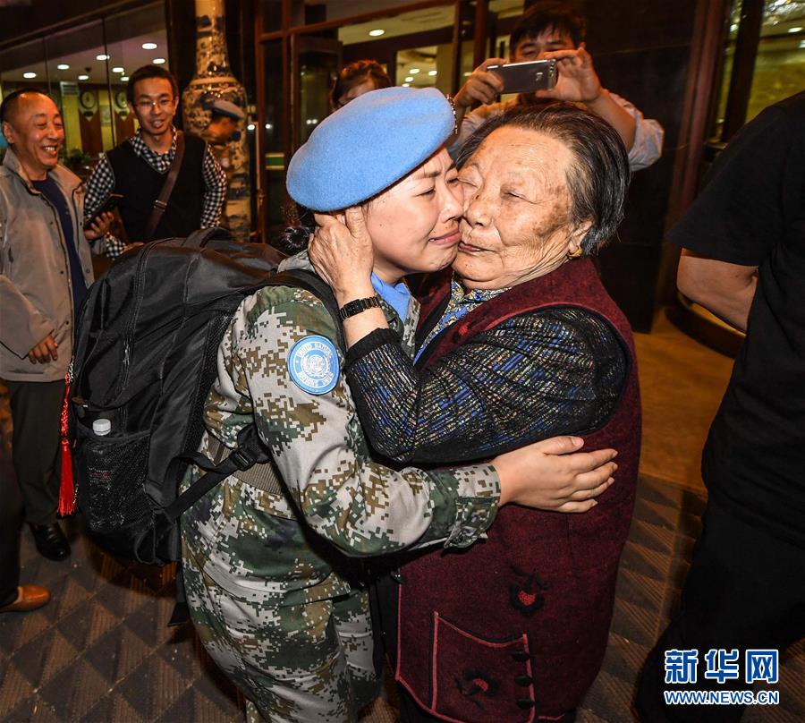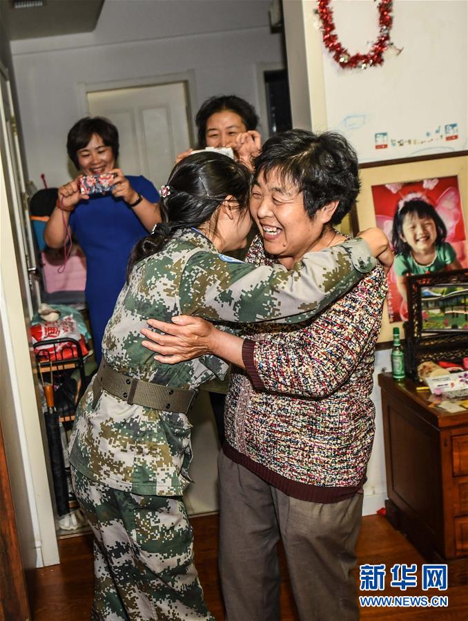 原沈阳军区总医院放射诊断科主管技师张兵(左)给女儿佩戴自己从马里带回的礼物(5月18日摄)。 夏初,沈阳,午夜。 27个月大的杨悦芯,在胡桃木色的儿童床里睡得香甜。手臂上,几下抚摸,杨悦芯从梦中醒来。懵懂睁开眼看见,弯腰立于床前的,是阔别一年之久的妈妈。 “宝贝,我是妈妈。我回来了。” “妈妈。” “哎。” 瞬间泪奔的周姝,回身紧紧抓住丈夫手肘。“听到了吗?她叫我妈妈。她还认识我。” 这声“妈妈”迟到了多久,周姝就在非洲马里期盼了多久。 5月18日下午,由原沈阳军区总医院抽组的维和医疗队第一梯队40名成员,抵达长春龙嘉机场,安全返回祖国,圆满完成在马里的一年维和任务。新华社记者潘昱龙 摄