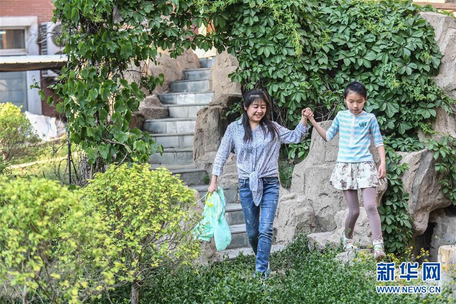 原沈阳军区总医院放射诊断科主管技师张兵(左)与女儿在自家小区内玩耍(5月19日摄)。新华社记者 潘昱龙 摄