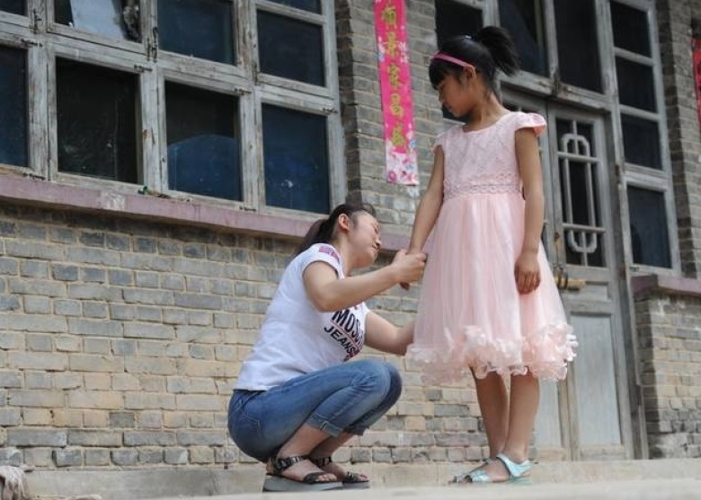 张美艳的家位于吕梁岚县岚城镇双井村一处破旧的小院里。3年前父母离异后,妈妈远走内蒙古,爸爸也外出打工,家里只剩下美艳和因腰椎病常年卧床的爷爷及年迈的奶奶,祖孙3人相依为命。图为女儿穿上妈妈给买的新裙子,她的视线一直停留在妈妈脸上。