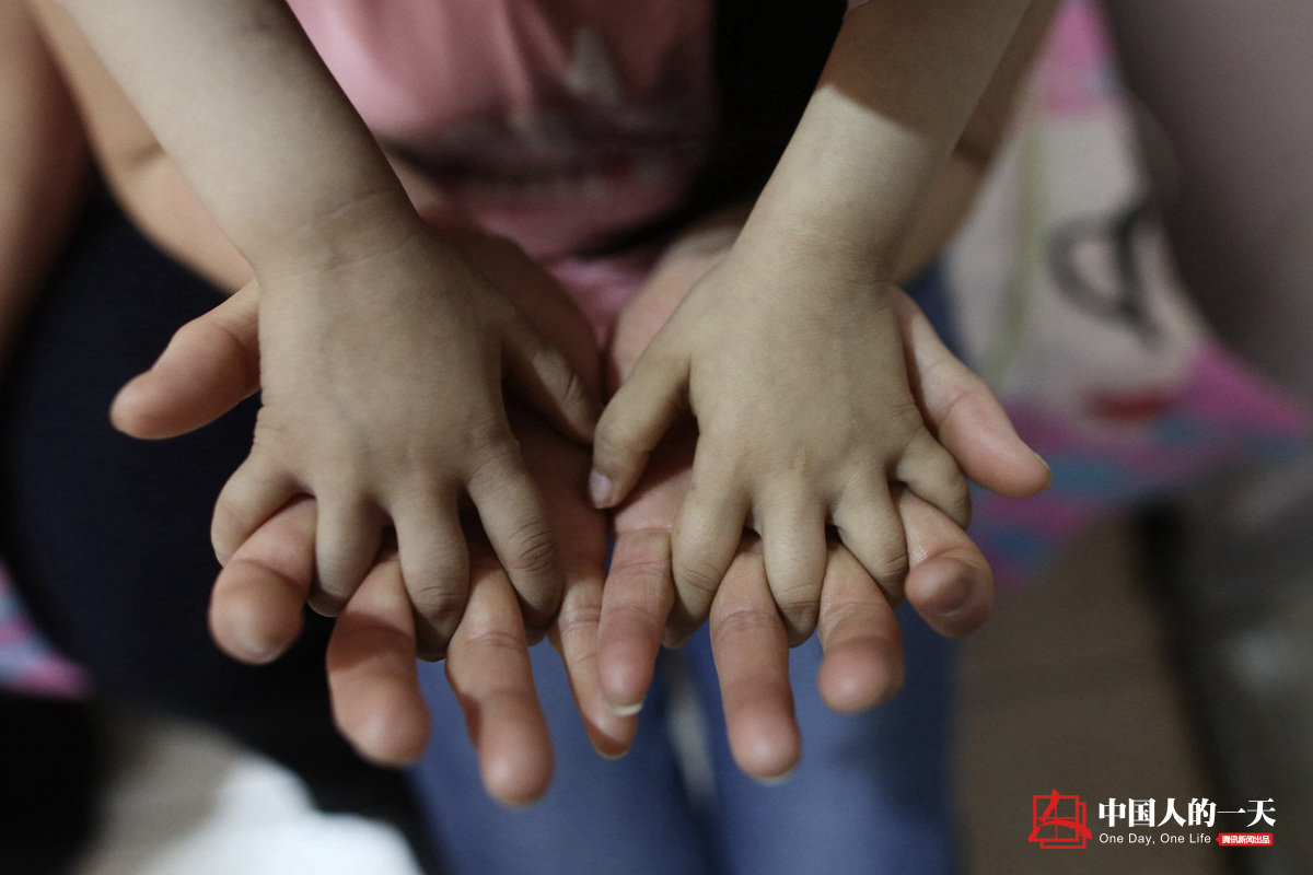欣欣握着妈妈的手,经过长期化疗,她的肤色有些苍白。