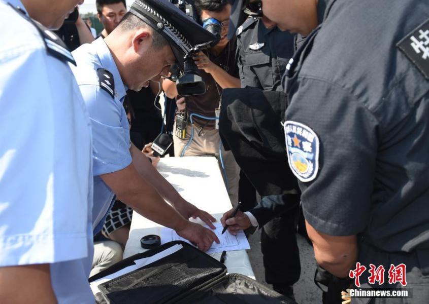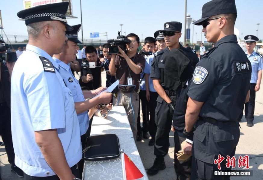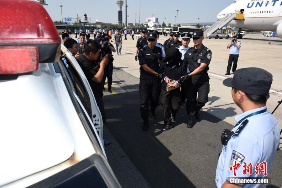 6月1日,中国籍严重刑事犯罪嫌疑人朱某在北京首都国际机场停机坪被警方验明身份后带走。当天,朱某被美国执法人员移交给中国警方。摄影:侯宇