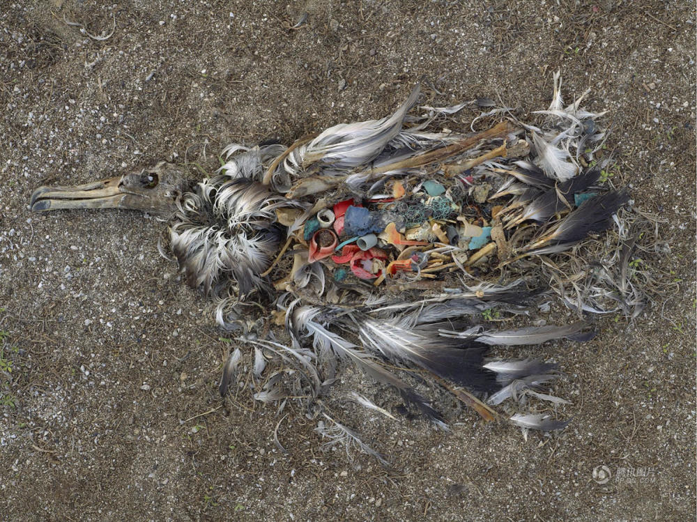 2009年,美国著名“垃圾摄影家”克里斯·乔丹(Chris Jordan)和自己的同伴来到位于北太平洋的中途岛,拍摄了因吞食塑料垃圾而死去的信天翁幼鸟尸体的系列照片。在这些照片里,信天翁的皮肉内脏已几近风化完尽,只剩下骨架、羽毛和喙,但身体“里面”却堆满了塑料垃圾:打火机、瓶盖、塑料小球、尼龙线、玩具零件。视觉中国