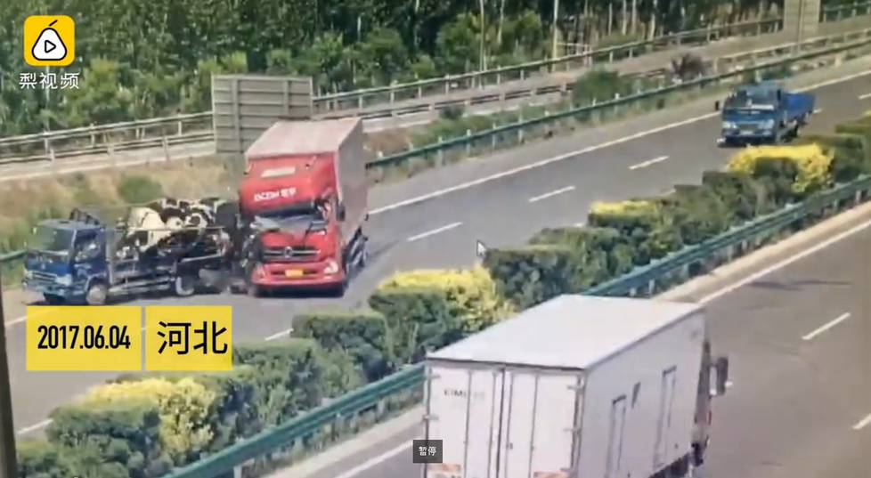 河北廊坊:货运车猛怼奶牛车 奶牛摔一地