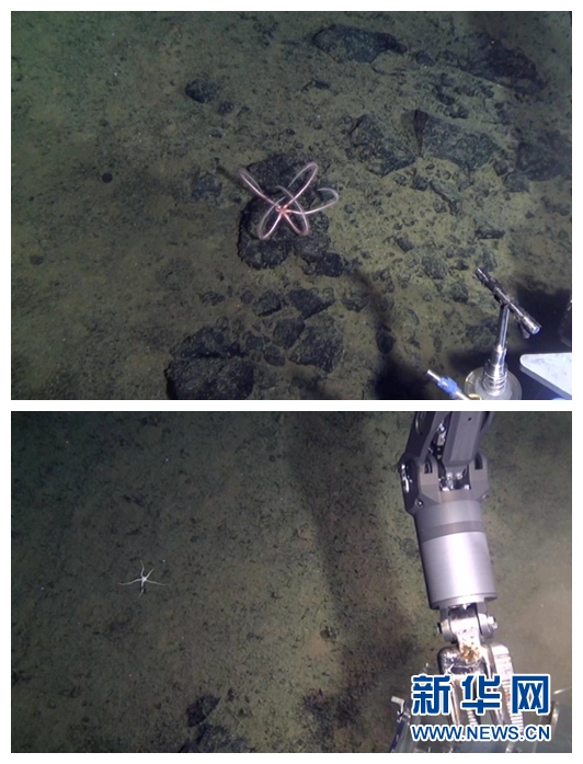 6月5日, “蛟龙”号载人潜水器在雅浦海沟海底拍摄的海星与海蛇尾(拼版照片)。