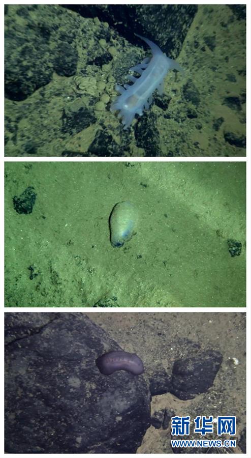 6月5日, “蛟龙”号载人潜水器在雅浦海沟海底拍摄的3种海参(拼版照片)。