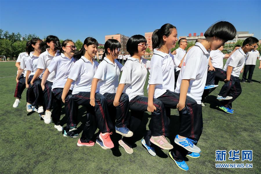 6月6日,河北省衡水市第二中学高三学生在运动场上通过趣味运动释放考前压力。当日,记者从教育部获悉,2017年全国统一高考将于6月7日至8日进行,部分省(区、市)由于考试科目设置不同,9日仍安排有考试科目。今年全国高考报名考生共940万人。新华社记者牟宇 摄
