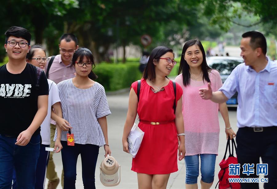 6月6日,福建莆田第二中学的高考考生跟老师(右一)交流,以轻松心态迎接高考。当日,记者从教育部获悉,2017年全国统一高考将于6月7日至8日进行,部分省(区、市)由于考试科目设置不同,9日仍安排有考试科目。今年全国高考报名考生共940万人。新华社记者魏培全 摄