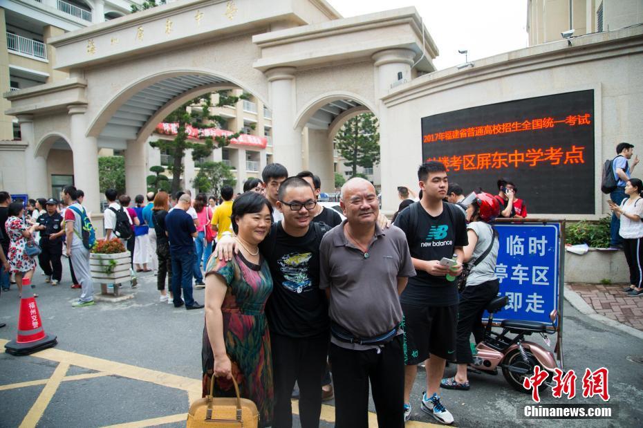 6月8日下午5时,为期两天的2017年全国统一高考落幕。福州屏东中学考点外,大批考生家长翘首等待高考最后一门考试的结束。随着考试结束铃声响起,考生门纷纷走出考场,寻找自己的亲人,第一时间与他们分享高考结束后的喜悦。图为考生与家人合影留念。李南轩摄